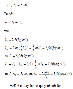 Hỏi vận tốc góc của ghế và người đó nếu co tay lại để khoảng cách giữa hai quả tạ chỉ là 0,6 m. Biết mô men quán tính của người và ghế là 2,5 kg/m2