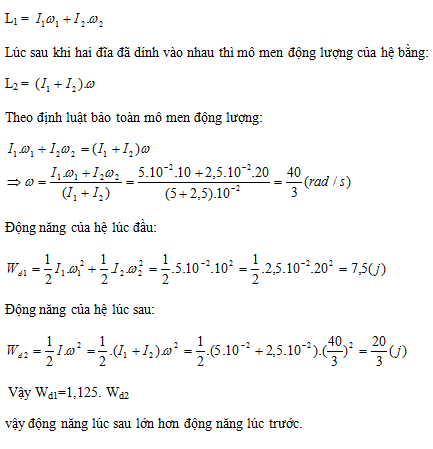 Hai đĩa tròn có mô men quán tính I1 = 5.10-2 kg.m2 và I2 = 2,5.10-2 kg.m2 đang quay đồng trục và cùng chiều với tốc độ góc ω1 = 10 rad/s ; ω2 = 20 rad/s. Ma sát ở trục quay nhỏ không đáng kể. Sau đó cho hai đĩa dính và nhau. Hệ quay với tốc độ góc ω. Động năng của hệ hai đĩa lúc sau tăng hay giảm bao nhiêu lần so với lúc đầu?