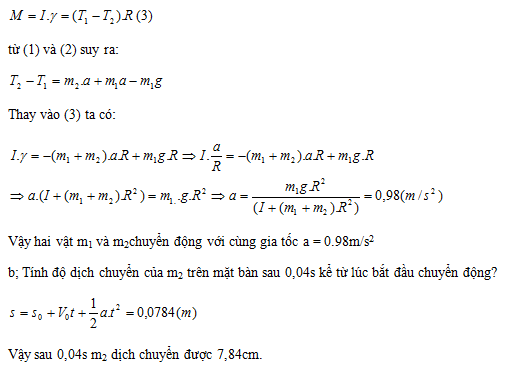 b; Tính độ dịch chuyển của m2 trên mặt bàn sau 0,04s kể từ lúc bắt đầu chuyển động?