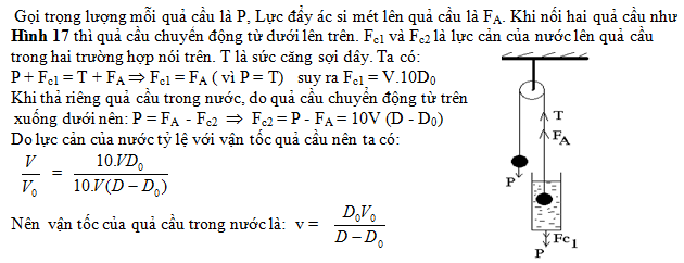 Hai quả cầu giống nhau được nối với nhau bởi một sợi dây nhẹ không dãn vắt qua ròng rọc cố định. Một quả nhúng trong bình nước (hình vẽ). Tìm vận tốc chuyển động của các quả cầu. Biết rằng khi thả riêng một quả cầu vào bình nước thì quả cầu chuyển động đều với vận tốc V0. Lực cản của nước tỷ lệ với vận tốc quả cầu. Cho khối lượng riêng của nước và chất làm quả cầu lần lượt là D0 và D.