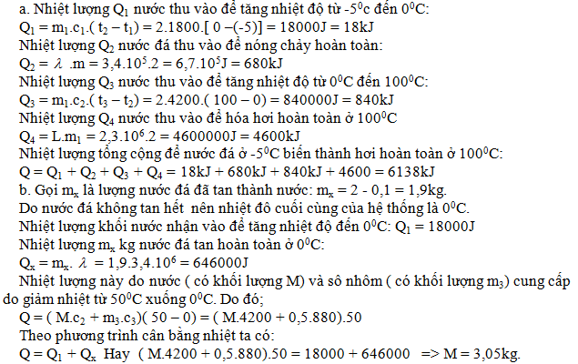 b/ Nếu bỏ khối đá trên vào sô nhôm chứa nước ở 500C, sau khi cân bằng nhiệt người ta thấy còn sót lại 100g nước đá chưa tan hết. Tính lượng nước có trong sô nhôm. Biết sô nhôm có khối lượng m2 = 500g và nhiệt dung riêng của nhôm là 880J/kg.K