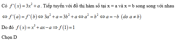 Cho hàm số f(x) = x3 + ax + b (a ≠ b). Tiếp tuyến với đồ thị hàm số f(x) tại x = a và x = b song song với nhau. Tính f(1) ?