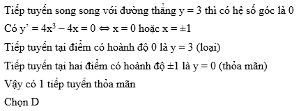 Số tiếp tuyến của đồ thị hàm số y = x4 – 2x2 + 3 biết tiếp tuyến đó song song với đường thẳng y = 3 là: