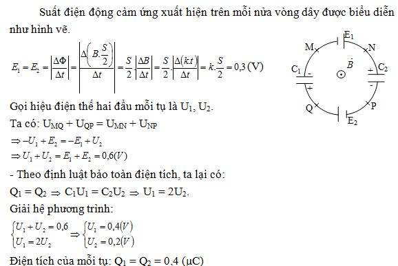 Vòng dây dẫn diện tích S = 1m2 đặt trong một từ trường đều có vuông góc với mặt phẳng vòng dây. Hai tụ điện C1 = 1μF, C2 = 2μF được mắc nối tiếp trong vòng dây ở vị trí xuyên tâm đối. Cho B thay đổi theo thời gian B = kt, k = 0,6T/s. Tính hiệu điện thế và điện tích của mỗi tụ.