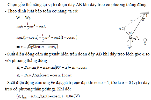 Một đoạn dây dẫn thẳng AB, chiều dài l = 20cm được treo nằm ngang bằng hai dây dẫn mảnh nhẹ thẳng đứng, chiều dài L = 40cm. Hệ thống được đặt trong một từ trường đều thẳng đứng, B = 0,1T. Kéo lệch AB để dây treo hợp với phương thẳng đứng một góc α0 = 60o rồi buông tay. Tìm biểu thức suất điện động cảm ứng xuất hiện trong thanh AB khi dây treo lệch một góc α so với phương thẳng đứng. Bỏ qua lực cản không khí. Từ đó suy ra suất điện động cảm ứng cực đại.