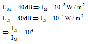 Một sóng âm truyền trong không khí. Mức cường độ âm tại điểm M và tại điểm N lần lượt là 40 dB và 80 dB. Tỉ số giữa cường độ âm tại N và cường độ âm tại M là: