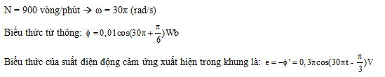 Một khung dây quay đều trong từ trường B vuông góc với trục quay của khung với tốc độ n = 900 vòng/ phút. Tại thời điểm t = 0, véctơ pháp tuyến n của mặt phẳng khung dây hợp với B một góc 300. Từ thông cực đại gởi qua khung dây là 0,01Wb. Biểu thức của suất điện động cảm ứng xuất hiện trong khung là