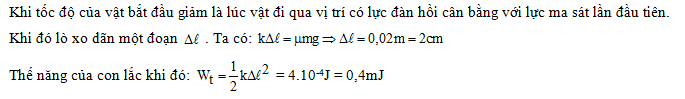 Một con lắc lò xo trên mặt phẳng nằm ngang gồm lò xo nhẹ có độ cứng 2N/m và vật nhỏ khối lượng 40g. Hệ số ma sát trượt giữa vật và mặt phẳng ngang là 0,1. Ban đầu giữ vật ở vị trí lò xo bị giãn 20cm rồi buông nhẹ để con lắc dao động tắt dần. Lấy g= 10m/s2 . Đến thời điểm tốc độ của vật bắt đầu giảm, thế năng của con lắc lò xo bằng bao nhiêu?.