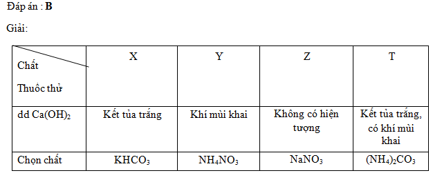 Có 4 lọ dung dịch riêng biệt X, Y, Z và T chứa các chất khác nhau trong số bốn chất: (NH4)2CO3, KHCO3, NaNO3, NH4NO3. Bằng cách dùng dung dịch Ca(OH)2 cho lần lượt vào từng dung dịch, thu được kết quả sau: