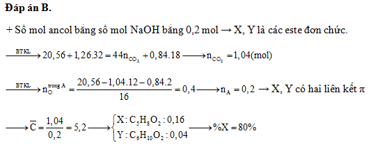 Cho hỗn hợp A gồm hai chất hữu cơ mạch hở X, Y (chỉ chứa C, H, O mà MX < MY) tác dụng vừa đủ với 200 ml dung dịch NaOH 1M, thu được 0,2 mol một ancol đơn chức và 2 muối của hai axit hữu cơ đơn chức, kế tiếp nhau trong dãy đồng đẳng. Mặt khác đốt cháy 20,56 gam A cần 1,26 mol O2 thu được CO2 và 0,84 mol H2O. Phần trăm số mol của X trong A là
