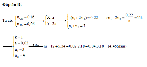 Hỗn hợp M gồm hai peptit X và Y, chúng cấu tạo từ một amino axit và có tổng số nhóm -CO-NH- trong 2 phân tử là 5 với tỉ lệ mol nX: nY=1:2. Thủy phân hoàn toàn m gam M thu được 12 gam glixin và 5,34gam alanin. Giá trị của m: