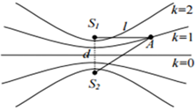 Hai nguồn sóng kết hợp S1 và S2 cách nhau 2m và dao dộng điều hòa cùng pha, phát ra hai bước sóng 1m. Một điểm A nằm ở khoảng cách l kể từ S1và \({\rm{A}}{{\rm{S}}_1} \bot {S_1}{S_2}\).