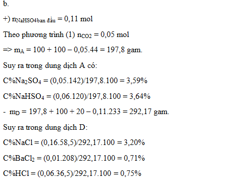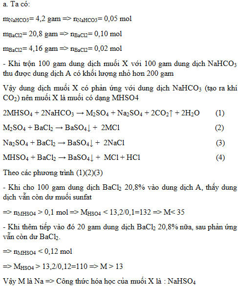 1. Trộn 100 gam dung dịch chứa một chất tan X có nồng độ 13,2% (X là muối của kim loại kiềm có chứa gốc sunfat) với 100 gam dung dịch NaHCO3 4,2%. Sau khi phản ứng xong thu được dung dịch A có khối lượng nhỏ hơn 200 gam. Nếu cho 100 gam dung dịch BaCl2 20,8% vào dung dịch A, đến khi phản ứng hoàn toàn thì dung dịch thu được vẫn còn dư muối sunfat. Khi thêm tiếp vào đó 20 gam dung dịch BaCl2 20,8%, phản ứng xong thu được dung dịch D có chứa BaCl2.