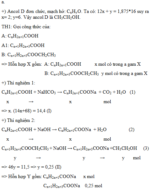 2. A và A1 là hai axit cacboxylic no, đơn chức, mạch hở, có khối lượng phân tử hơn kém nhau 14 đvC. B là este tạo bởi A1 và ancol đơn chức, mạch hở D. Biết trong phân tử ancol D, tổng khối lượng của cacbon và hiđro gấp 1,875 lần khối lượng oxi. Hỗn hợp X gồm A và B. Tiến hành hai thí nghiệm sau: