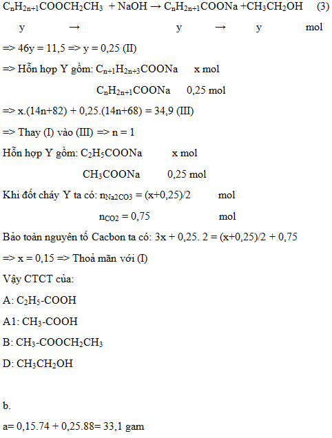 Thí nghiệm 2: Cho a gam hỗn hợp X tác dụng với dung dịch NaOH (vừa đủ) thu được 34,9 gam hỗn hợp muối Y và 11,5 gam ancol D. Đốt cháy hoàn toàn hỗn hợp Y thu được Na2CO3, hơi nước và 16,8 lít khí CO2 (đktc).
