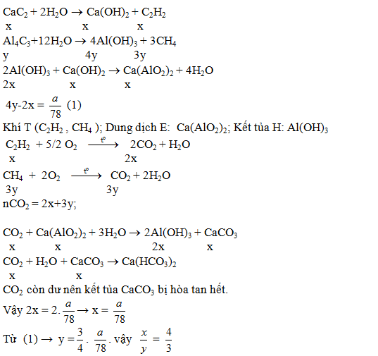 2. Hỗn hợp M gồm CaC2 x mol và Al4C3 y mol. Cho một lượng nhỏ M vào H2O dư thu được dung dịch E, hỗn hợp khí T và a gam kết tủa H. Đốt cháy hết hỗn hợp T rồi cho toàn bộ sản phẩm vào dung dịch E thu được 2a gam kết tủa. Biết các phản ứng xảy ra hoàn toàn. Tính tỉ lệ x:y.