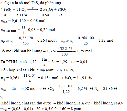 1. Trong một bình kín dung tích không đổi chứa 9,6 gam FeS2 và không khí (lấy dư 20% so với lượng cần thiết để phản ứng hết với FeS2 trên). Nung nóng bình, sau một thời gian đưa về điều kiện ban đầu thì số mol khí trong bình giảm 2,27% so với ban đầu.
