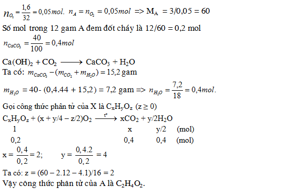 2. Đốt cháy hoàn toàn 12,0 gam một hợp chất hữu cơ X chỉ thu được CO2 và H2O. Dẫn toàn bộ sản phẩm cháy vào dung dịch Ca(OH)2 dư thấy có 40 gam kết tủa và dung dịch sau phản ứng có khối lượng giảm 15,2 gam so với dung dịch Ca(OH)2 ban đầu. Biết rằng 3,0 gam A ở thể hơi có thể tích bằng thể tích của 1,6 gam oxi ở cùng điều kiện nhiệt độ và áp suất. Tìm công thức phân tử của X.