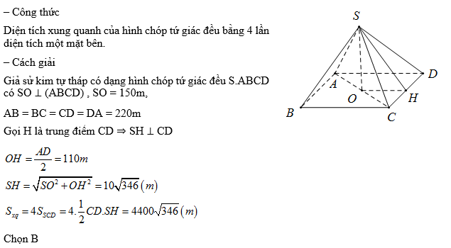 Một kim tự tháp ở Ai Cập được xây dựng vào khoảng 2500 trước Công nguyên. Kim tự tháp này là một khối chóp tứ giác đều có chiều cao 150 m, cạnh đáy dài 220 m. Diện tích xung quanh của kim tự tháp này là: