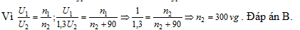 Đặt vào hai đầu cuộn sơ cấp của máy biến áp lí tưởng điện áp xoay chiều có giá trị hiệu dụng không đổi. Nếu quấn thêm vào cuộn thứ cấp 90 vòng thì điện áp hiệu dụng hai đầu cuộn thứ cấp để hở thay đổi 30% so với lúc đầu. Số vòng dây ban đầu ở cuộn thứ cấp là