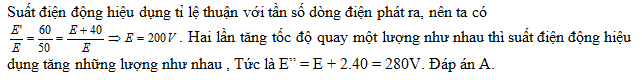 Trong một máy phát điện xoay chiều một pha, nếu tốc độ quay của rôto tăng thêm 60 vòng/phút thì tần số của dòng điện xoay chiều do máy phát ra tăng từ 50 Hz đến 60 Hz và suất điện động hiệu dụng của máy thay đổi 40 V so với ban đầu. Nếu tiếp tục tăng tốc độ quay của rôto thêm 60 vòng/phút nữa thì suất điện động hiệu dụng do máy phát ra khi đó là