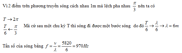 Một sóng âm truyền trong thép với tốc độ 5820 m/s. Nếu độ lệch pha của sóng âm đó ở hai điểm gần nhau nhất cách nhau 1m trên cùng một phương truyền sóng là π/3 thì tần số của sóng bằng :