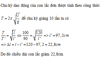 Một con lắc đơn có chiều dài l = 120 cm, dao động điều hoà với chu kì T. Để chu kì con lắc giảm 10 % thì chiều dài con lắc phải