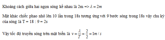 Một người quan sát 1 chiết phao trên mặt biển thấy nó nhô lên cao 10 lần trong 18 s, khoảng cách giữa hai ngọn sóng kề nhau là 2m. Vận tốc truyền sóng trên mặt biển là