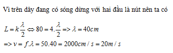 Một sợi dây đàn hồi có độ dài AB = 80 cm, đầu B giữ cố định, đầu A gắn với cần rung dao động điều hòa với tần số ƒ = 50 Hz theo phương vuông góc với AB. Trên dây có một sóng dừng với 4 bụng sóng, coi A và B là nút sóng. Tốc độ truyền sóng trên dây là