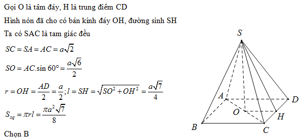 Cho hình chóp tứ giác đều S.ABCD có cạnh đáy bằng a, cạnh bên hợp với mặt đáy góc 60o. Hình nón có đỉnh S, đáy là đường tròn nội tiếp tứ giác ABCD có diện tích xung quanh là: