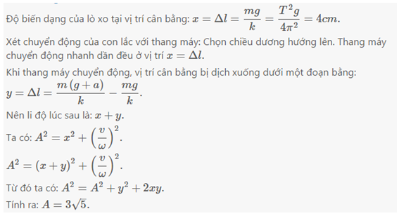 Một con lắc lò xo được treo trên trần một thang máy. Khi thang máy đứng yên thì con lắc được kích thích dao động điều hòa theo phương thẳng đứng với chu kỳ 0,4 s, biên độ 5 cm. Vừa lúc quả cầu của con lắc đang đi qua vị trí lò xo không biến dạng theo chiều từ trên xuống thì thang máy chuyển động nhanh dần đều đi lên với gia tốc có độ lớn 5 m/s2 . Lấy g = π2 (m/s2 )= 10 (m/s2 ). Sau đó con lắc dao động với biên độ là