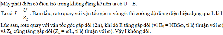 Một máy phát điện xoay chiều 1 pha có điện trở trong không đáng kể. Nối 2 cực máy phát với 1 cuộn dây thuần cảm. Khi rôto của máy quay với vận tốc góc n vòng/s thì cường độ dòng điện đi qua cuộn dây có cường độ hiệu dụng I. Nếu rôto quay với vận tốc góc 2n vòng/s thì cường độ hiệu dụng của dòng điện trong mạch là: