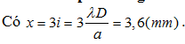 Trong thí nghiệm Yâng về giao thoa ánh sáng, khoảng cách giữa hai khe là 1 mm, khoảng cách từ mặt phẳng chứa hai khe đến màn quan sát là 2m. Nguồn sáng phát ra ánh sáng đơn sắc có bước sóng 0,6 µm. Trên màn, vân sáng thứ ba cách vân trung tâm một khoảng: