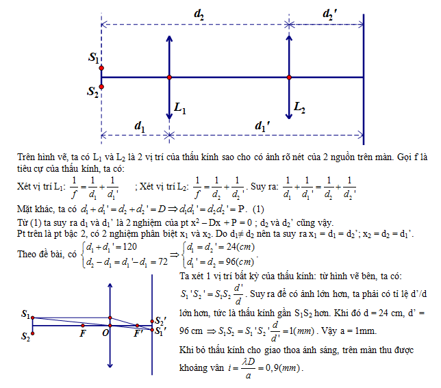 Trong thí nghiệm Y-âng về giao thoa ánh sáng, màn quan sát E cách mặt phẳng chứa hai khe S1S2 một khoảng D = 1,2m. Đặt giữa màn và mặt phẳng hai khe một thấu kính hội tụ, người ta tìm được hai vị trí của thấu kính cách nhau 72 cm cho ảnh rõ nét của hai khe trên màn, ở vị trí ảnh lớn hơn thì khoảng cách giữa hai khe ảnh S1’S2’ = 4 mm. Bỏ thấu kính đi, rồi chiếu sáng hai khe bằng nguồn điểm S phát bức xạ đơn sắc λ = 750nm thì khoảng vân thu được trên màn là: