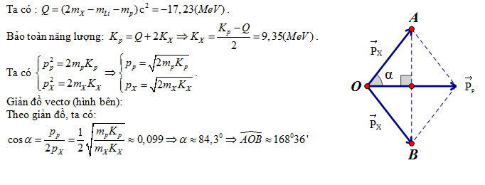 Cho hạt prôtôn có động năng KP = 1,46MeV bắn vào hạt nhân đứng yên. Hai hạt nhân X sinh ra giống nhau và có cùng động năng. Cho mLi = 7,0142u, mp = 1,0073u, mX = 4,0015u. Góc tạo bởi các vectơ vận tốc của hai hạt X sau phản ứng là: