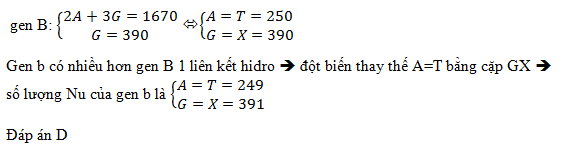 Gen B có 390 guanin và có tổng số liên kết hiđrô là 1670, bị đột biến thay thế một cặp