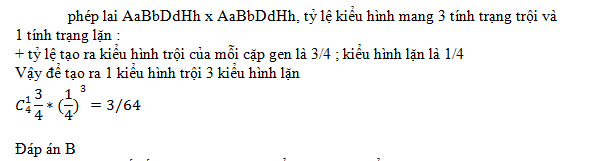 Trong trường hợp giảm phân và thụ tinh bình thường, một gen quy định một tính trạng và gen trội là trội hoàn toàn. Tính theo lí thuyết, phép lai AaBbDdHh x AaBbDdHh sẽ cho kiểu hình mang 1 tính trạng trội và 3 tính trạng lặn ở đời con chiếm tỉ lệ