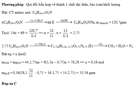 Đun nóng 0,4 mol hỗn hợp E gồm dipeptit X, tripeptit Y và tetrapeptit Z đều mạch hở bằng lượng vừa đủ dung dịch NaOH, thu được dung dịch chứa 0,5 mol muối của glyxin và 0,4 mol muối của alanin và 0,2 mol muối của valin. Mặt khác đốt cháy m gam E trong O2 vừa ddurr thu được hỗn hợp O2, H2O và N2, trong đó tổng khối lượng của CO2 và nước là 78,28g. Giá trị của m gần nhất với giá trị nào :