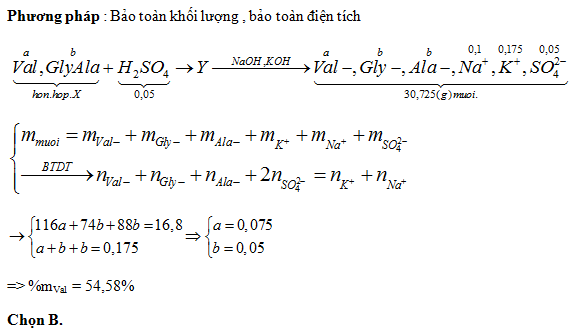 Hỗn hợp X gồm valin (có công thức C4H8NH2COOH)) và đipeptit Glyxylalanin. Cho m gam X vào 100ml dung dịch H2SO4 0,5M (loãng), thu được dung dịch Y. Cho toàn bộ Y phản ứng vừa đủ với 100ml dung dịch NaOH 1M và KOH 1,75M đun nóng thu được dung dịch chứa 30,725 gam muối. Phần trăm khối lượng của Valin trong X là :