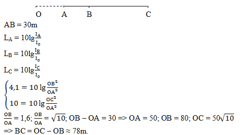 Cho 3 điểm A,B,C thẳng hang, theo thứ tự xa dần nguồn âm.Mức cường độ âm tại A,B,C lần lượt là 40dB; 35,9dB và 30dB. Khoảng cách giữa AB là 30m, và khoảng cách giữa BC là: