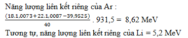Cho khối lượng của prôtôn; nơtron; Ar; Li lần lượt là: 1,0073u; 1,0087u; 39,9525u; 6,0145u và 1u =