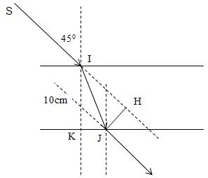 Một bản mặt song song có bề dày 10 cm, chiết suất n = 1,5 được đặt trong không khí. Chiếu tới bản song song một tia sáng SI có góc tới 45°. Khoảng cách giữa tia tới và tia ló là