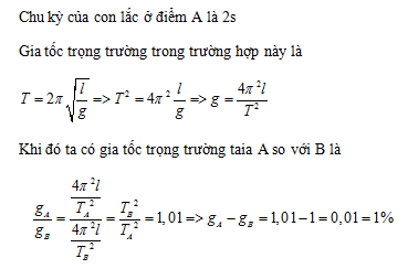 Một con lắc đơn dao động điều hòa tại địa điểm A với tần số 0,5Hz. Đưa con lắc này tới địa điểm B cho nó dao động điều hòa với chu kỳ 2,01s. Coi chiều dài dây treo của con lắc đơn không đổi. Gia tốc trọng trường tại A so với tại B