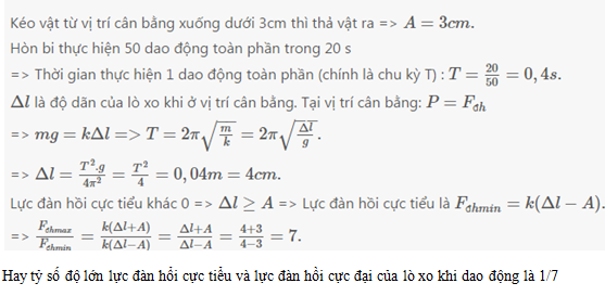 Con lắc lò xo treo thẳng đứng, lò xo có khối lượng không đáng kể. Hòn bi đang ở vị trí cân bằng thì được kéo xuống dưới theo phương thẳng đứng một đoạn 3cm rồi thả ra cho nó dao động. Hòn bi tực hiện 50 dao động mất 20s. Cho g = π2 = 10 m/s2. Tỷ số độ lớn lực đàn hổi cực tiểu và lực đàn hồi cực đại của lò xo khi dao động là.