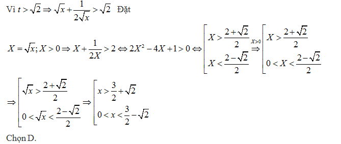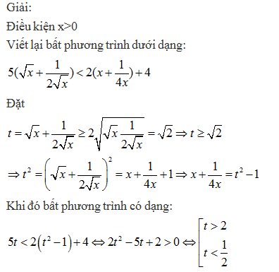 +) Nhóm các hạng tử cho hợp lí, đặt \(t = \sqrt x + \frac{1}{{2\sqrt x }}\), sử dụng bất đẳng thức Cô-si để tìm điều kiện của x.