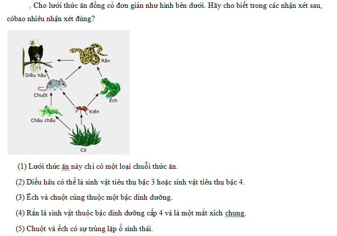(2) “Diều hâu có thể là sinh vật tiêu thụ bậc 3 hoặc sinh vật tiêu thụ bậc 4” là đúng.+ Đối với chuỗi thức ăn: Cỏ → châu chấu → chuột → diều hâu