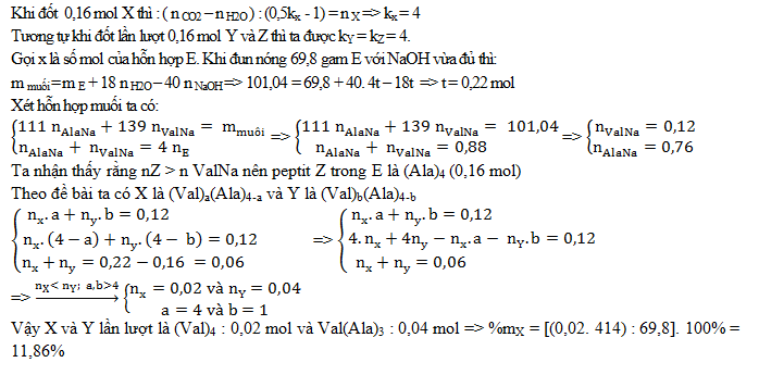 Hỗn hợp E gồm X, Y và Z là 3 peptit đều mạch hở (MX > MY > MZ). Đốt cháy 0,16 mol X hoặc Y hoặc Z đều thu được số mol CO2 lớn hơn số mol H2O là 0,16 mol. Nếu đun nóng 69,8 gamhỗn hợp chứa X, Y và 0,16 mol Z với dung dịch NaOH vừa đủ thu được dung dịch chứa 101,04 gam hai muối của alanin và valin. Biết nX < nY. Phần trăm khối lượng của X trong E gần nhất với :