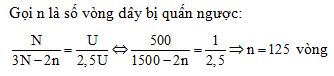 Môt máy biến áp lý tưởng có số vòng dây cuộn thứ cấp gấp 3 lần cuộn sơ cấp. Khi đặt vào hai đầu cuộn sơ cấp một điện áp xoay chiều có giá trị hiệu dụng U thì điện áp hiệu dụng ở đầu cuộn thứ cấp để hở là 2,5U. Khi kiểm tra thì phát hiện có một số vòng dây cuộn thứ cấp bị cuốn ngược chiều so với đa số các vòng dây của nó. Số vòng cuộn sơ cấp là 500. Số vòng dây cuốn ngược của cuộn thứ cấp là