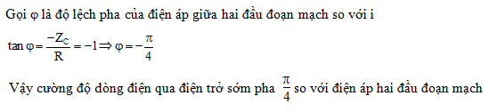 Một đoạn mạch điện xoay chiều gồm điện trở thuần R mắc nối tiếp với tụ điện C. Nếu dung kháng ZC bằng R thì cường độ dòng điện qua điện trở luôn