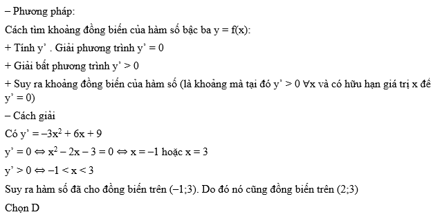 Hàm số y = –x3 + 3x2 + 9x đồng biến trên khoảng nào sau đây?